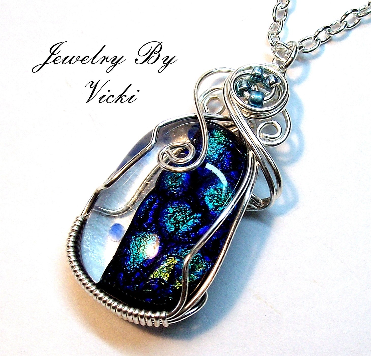 Beautiful, and full of fire, is this beautiful piece of handmade Dichroic Glass.All my wire work is done by hand,and one of a kind. Know two can ever be identical. I use 21 guage square non tarnish, permanent colored silver wire with a copper core,with blue seed bead accents in the swirl.