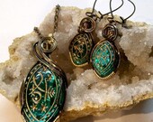 This is really an amazing necklace and earring set! The vintage cabochon's are teal green, glass with gold etched design. These are gold foil backed, etched deep and the pattern on top reflects to the back of the cab with an awesome effect. I have wire wrapped these beauties with bronze permanent colored non tarnish square wire.The gold wire is 14kgf. The wire wrapping is wrapped intirely, by hand, and by sculpt...Click Here to Visit My Etsy Shop!